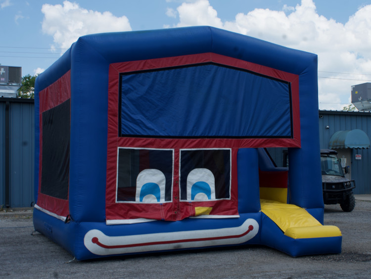 Bright, colorful bounce house with an attached slide — a perfect all-in-one play combo for backyard parties and events. Kids can jump safely inside the roomy, mesh-enclosed bouncing area and then climb up and whoosh down the inflatable slide for extra excitement. The mesh sides keep airflow and visibility high so adults can easily supervise, and the low step-and-arch entry makes getting in and out simple for younger guests. Durable vinyl construction and bold red, yellow, and blue colors make it eye-catching and party-ready. Great for birthday parties, family gatherings, school events, or any occasion where active, supervised play is wanted.